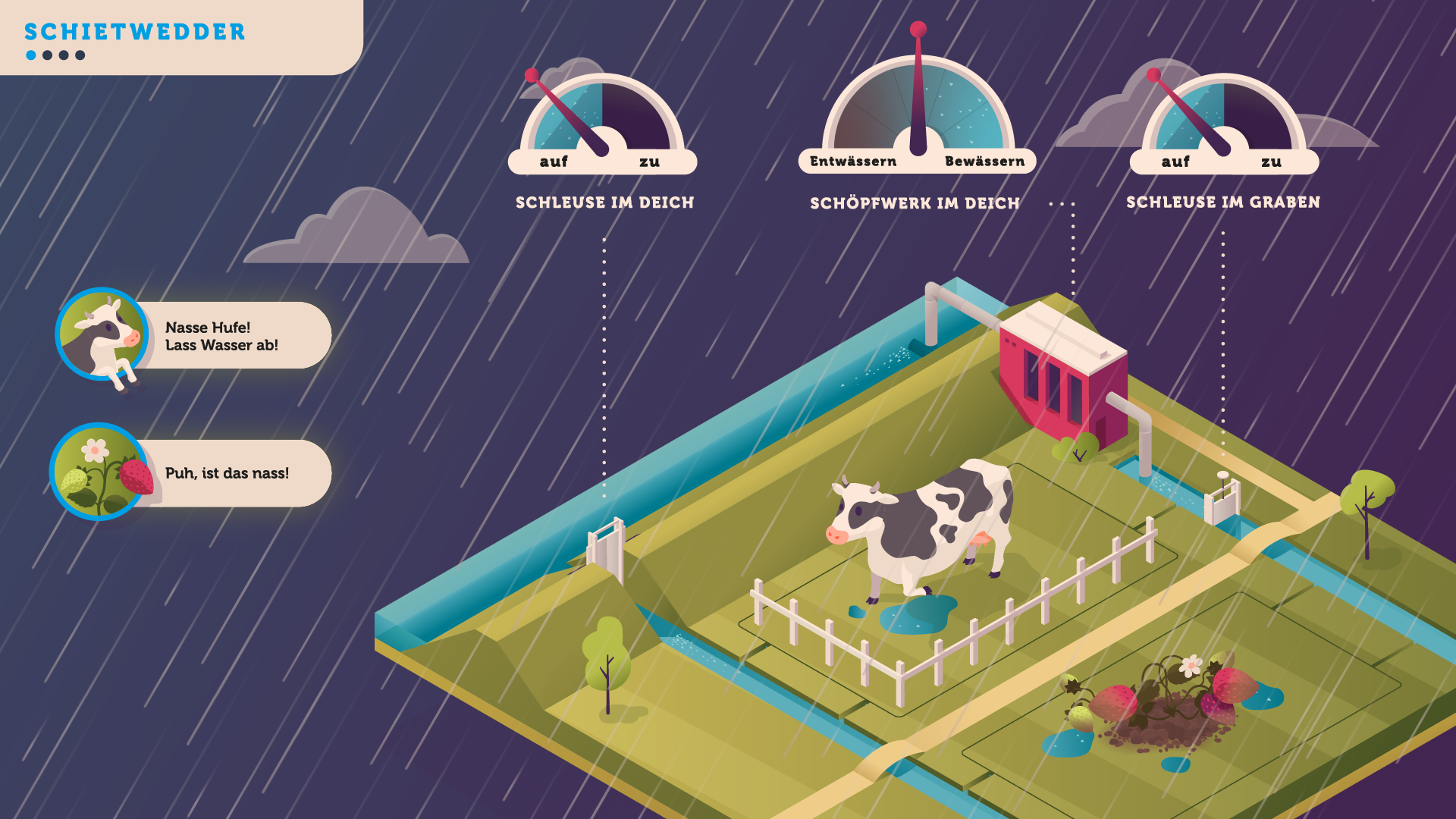Für die Bergedorfer Museumslandschaft entwickelten wir zusammen mit h neun und Graphscape den interaktiven Deichomaten zur Simulation verschiedener Szenarien am Deich: von Starkregen bis Dürre können nun vor Ort unterschiedliche Zustände spielerisch ausprobiert werden.